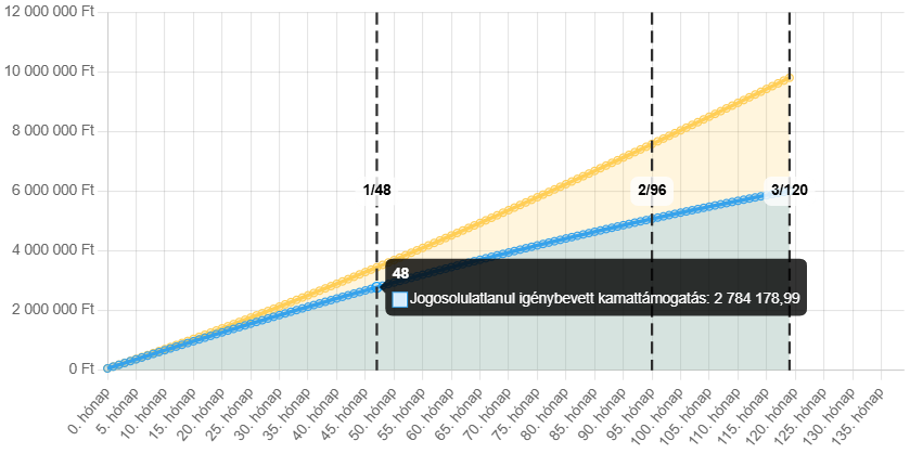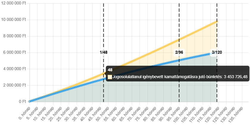 Tehát 15 milliós hitel és 48 hónap, azaz 4 év alatt is 2.784.179 Ft kamattámogatást hív le a bank egy ilyen hitel után az alapul vett referenciakamat mellett. De itt még nincs vége, mert a kékkel párhuzamosan indul a sárga vonal is, ami az erre rakódó büntetőkamatot mutatja: