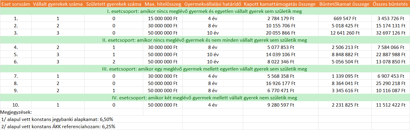 Visszafizetési szabály: amennyiben 10 év alatt 2 gyermek születik, a kapott kamattámogatást a 2 gyermek után járó kölcsön összegéhez kapcsolódó kamattámogatás összegével csökkentve kell visszafizetni.