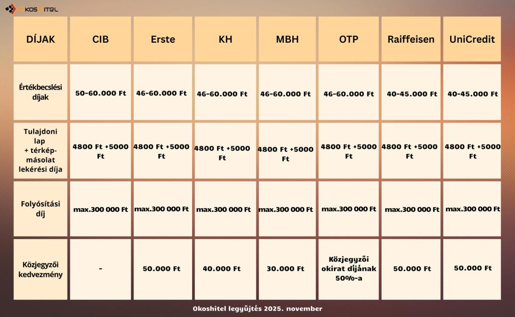 Nem teljesen értjük, de a mai napig van bank, amelyik nem engedi el a folyósítási díjat (a rendelet szerint ez a hitel összegének 0,75%-a, max. 300.000 Ft lehet). Eltérőek továbbá az értékbecslési és szemle díjak is, igaz, azokban „csak” pár ezres, néhány tízezres különbségek vannak csupán. Vagyis, ha egyébként több bank is szóba jöhet, akkor érdemes lehet ezekre is alaposan kitérni, elkerülendő több százezer Ft felesleges kifizetését.